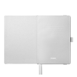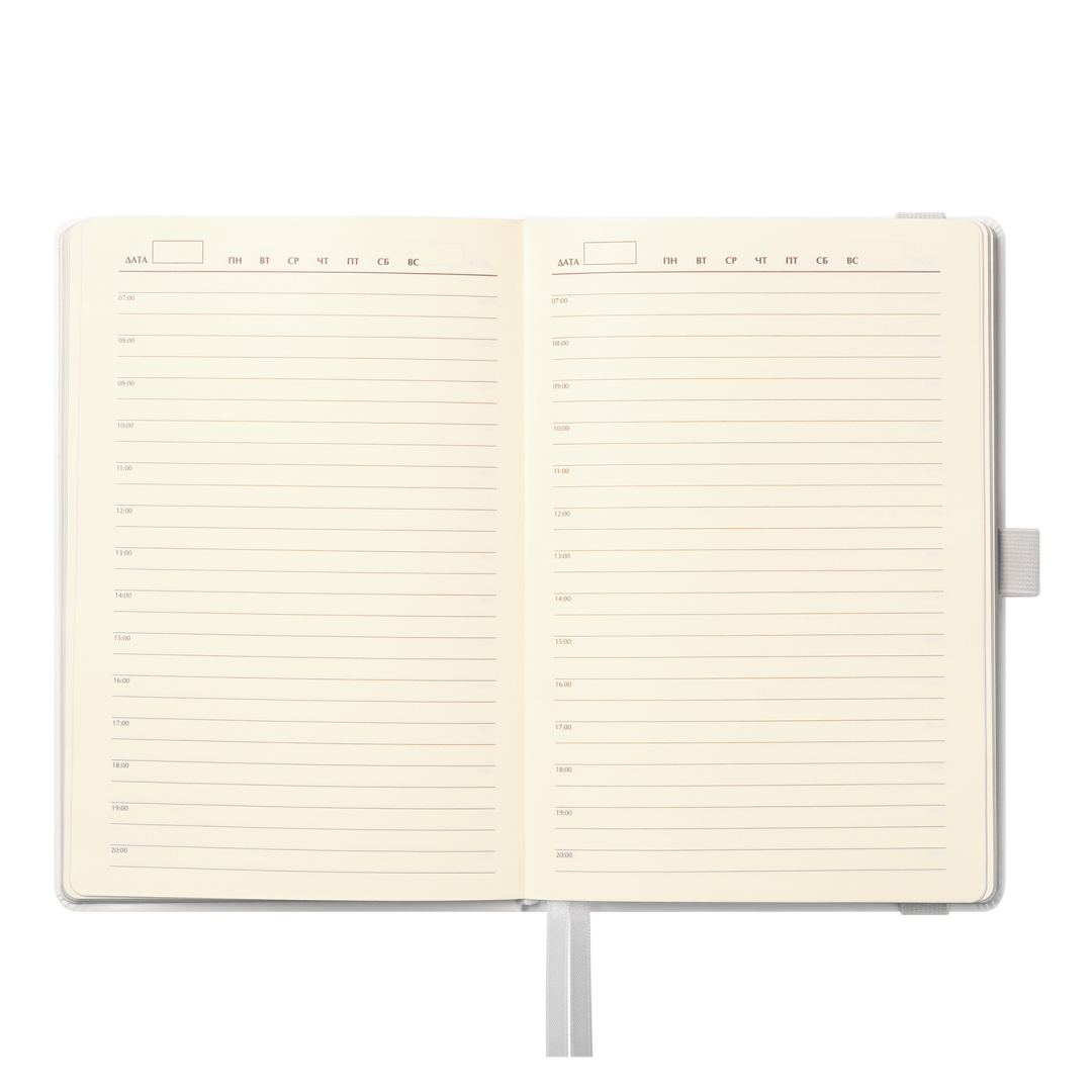 Недатированный ежедневник в жесткой обложке из качественной искусственной кожи. Материал обложки гладкий, текстурированный, с полуглянцевым блеском. Скругленные углы обложки и внутреннего блока. Отличительная особенность коллекции — голографический фольгированный срез блока. Форзац/нахзац– серые. Вариант в жесткой обложке украшен широкой вертикальной резинкой-фиксатором с вставкой из ПУ-материала обложки и петелькой под ручку, а также двойным ляссе (серым и в тон обложки).