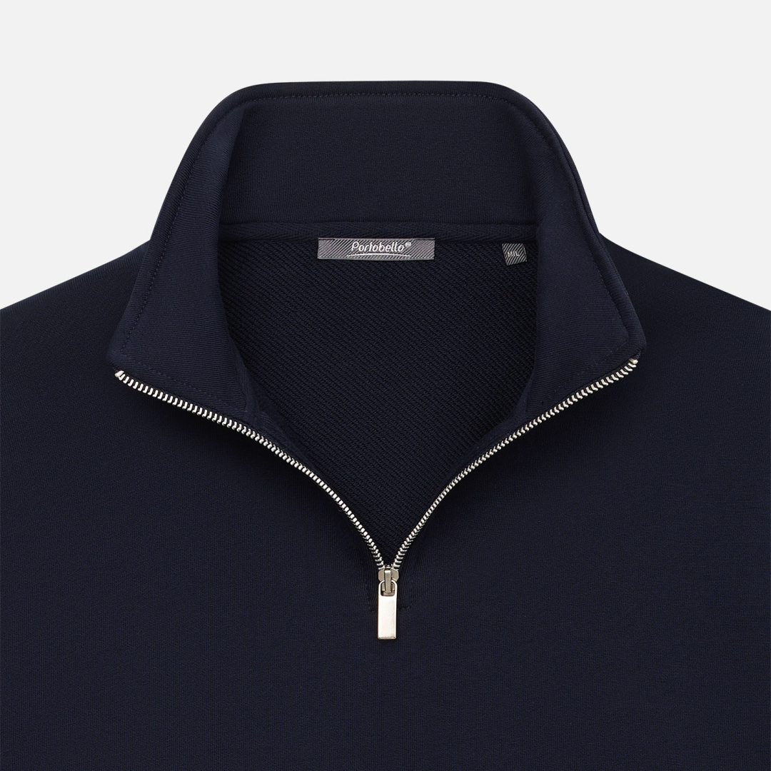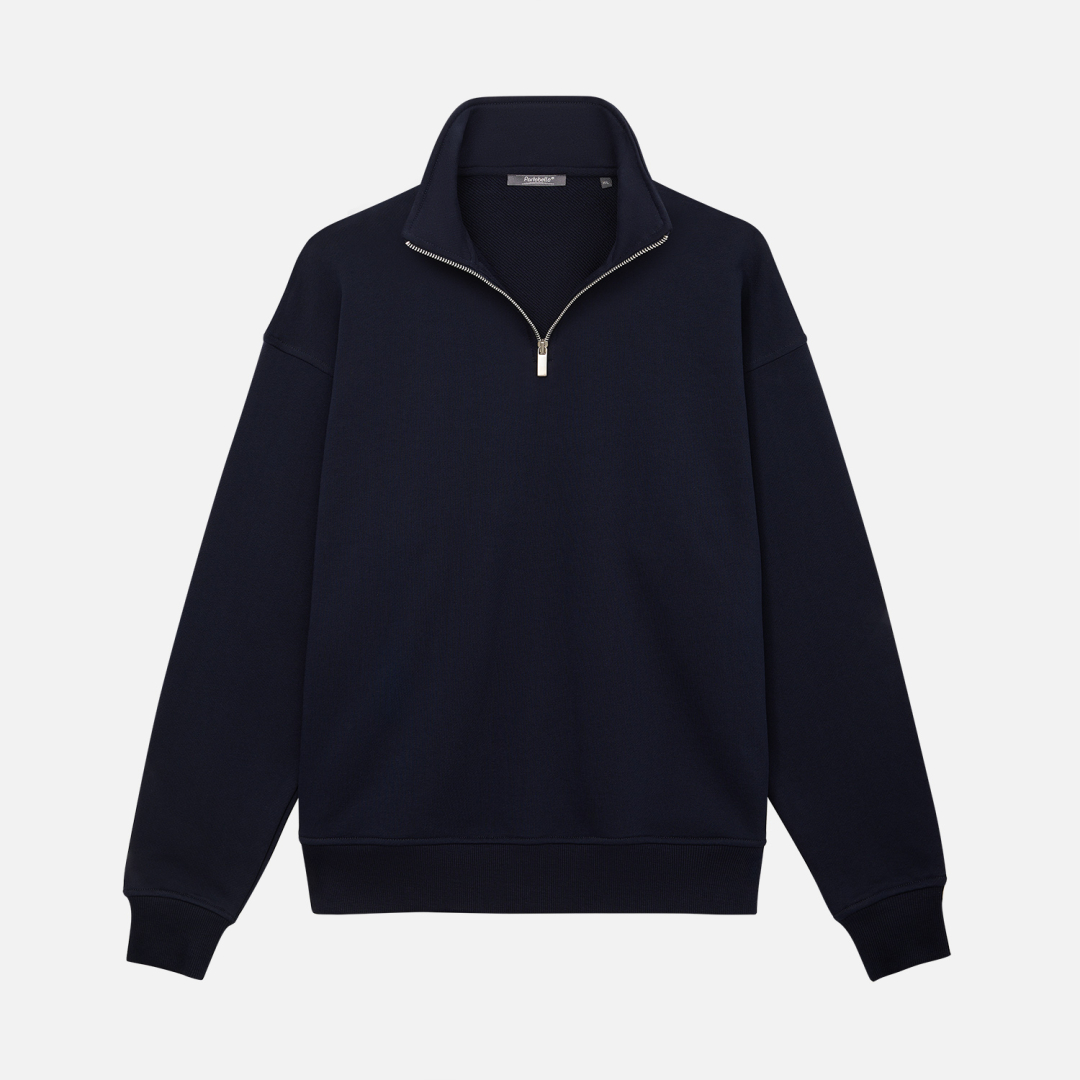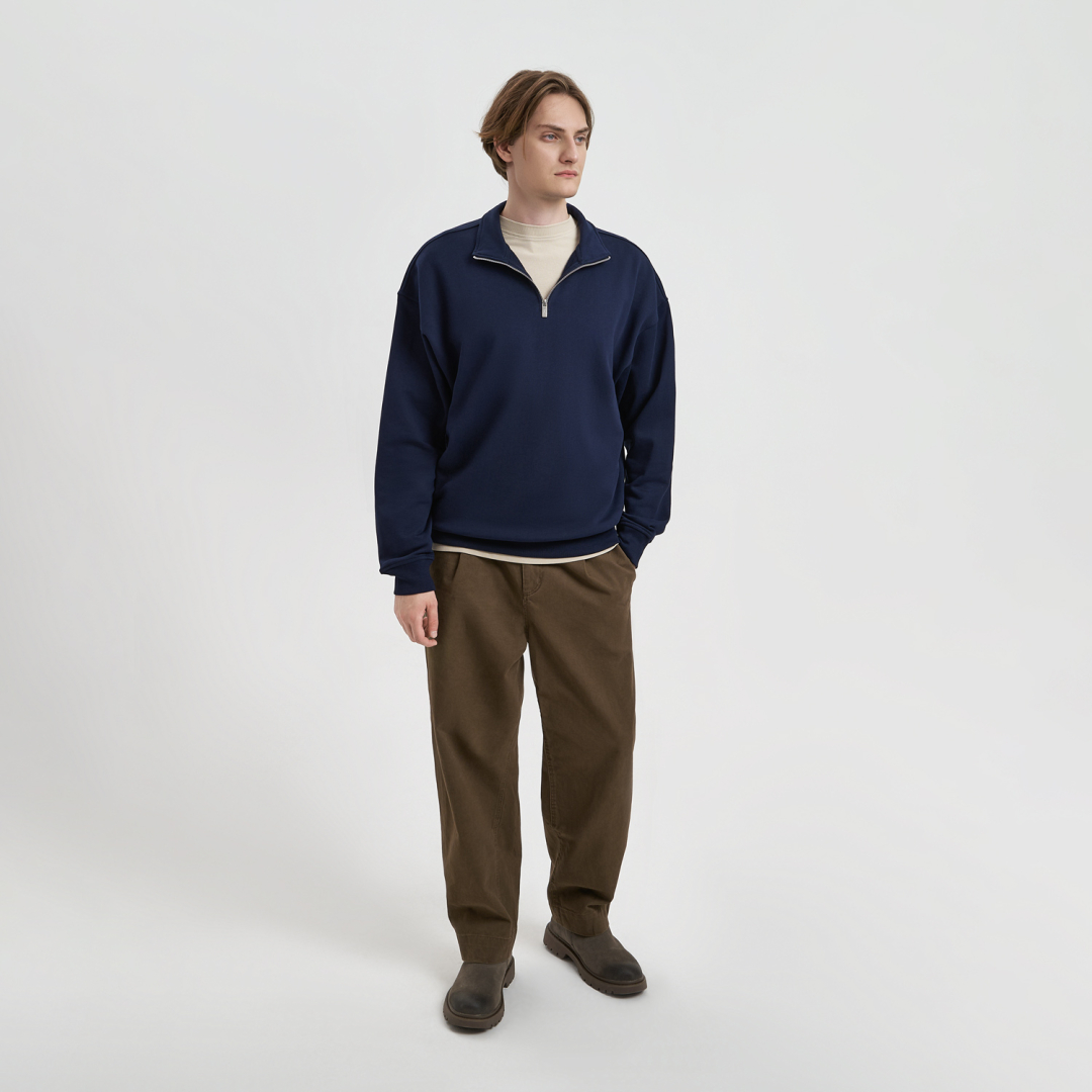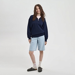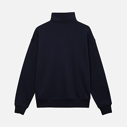 Универсальная толстовка с воротником-стойкой и заниженной линией плеча. По нижнему краю и на рукавах — эластичные резинки для комфортной и аккуратной посадки. Модель застёгивается на металлическую молнию.