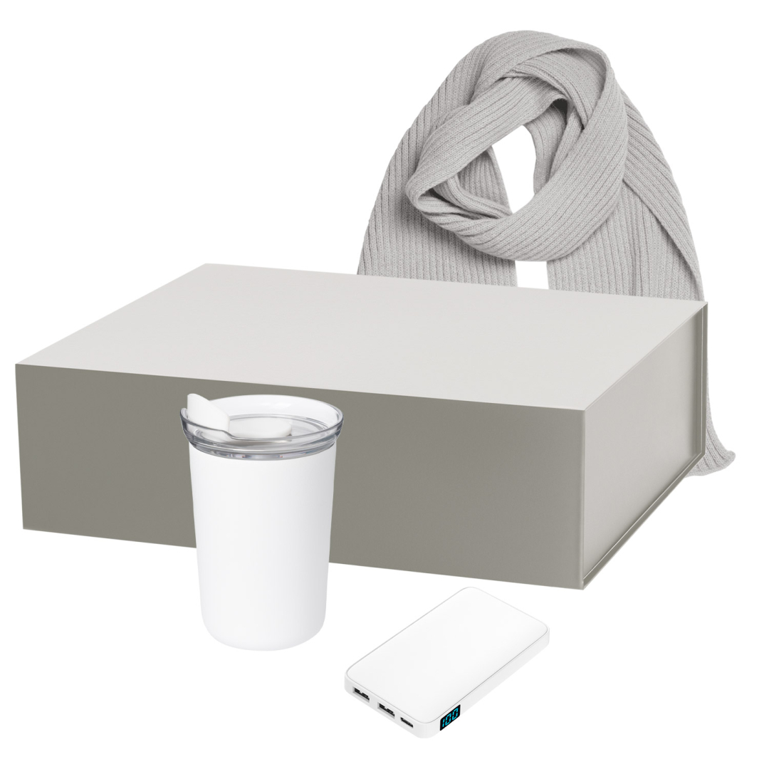 В наборе нём объединены три незаменимых аксессуара для поддержки уюта и комфорта в любых условиях: внешний аккумулятор, шарф и термокружка.